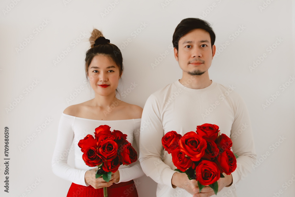 Asian Thai couple in white top, holding red roses, showing flowers while standing minimal over white background wall, wedding concept.
