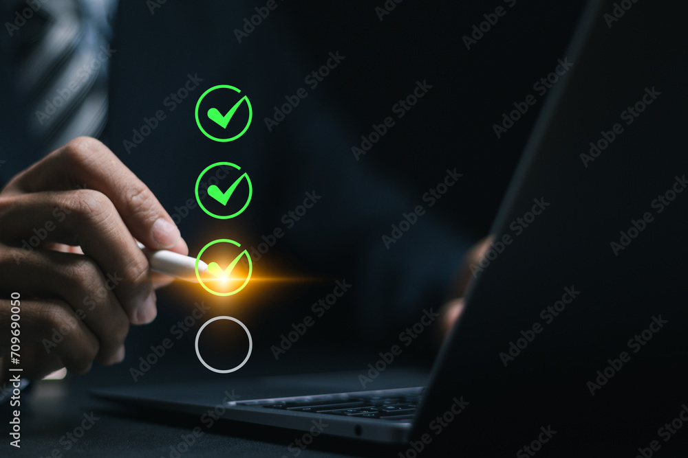 Businessman using laptop, Checking mark on checkboxes for checklist concept.