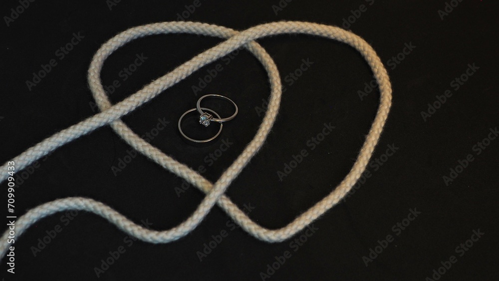 Tying the knot: heart shaped rope, one plain silvery ring and one diamond ring, with a black background