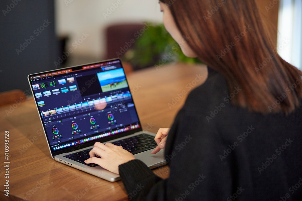 ノートパソコンにて動画編集を行うクリエイターの日本人女性