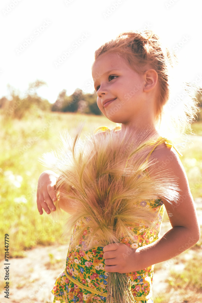 Little girl with autumn bouquet in the field. Happy child enjoying nature outdoors. Sunlit little girl smelling meadow fluffy grass. Soft toned