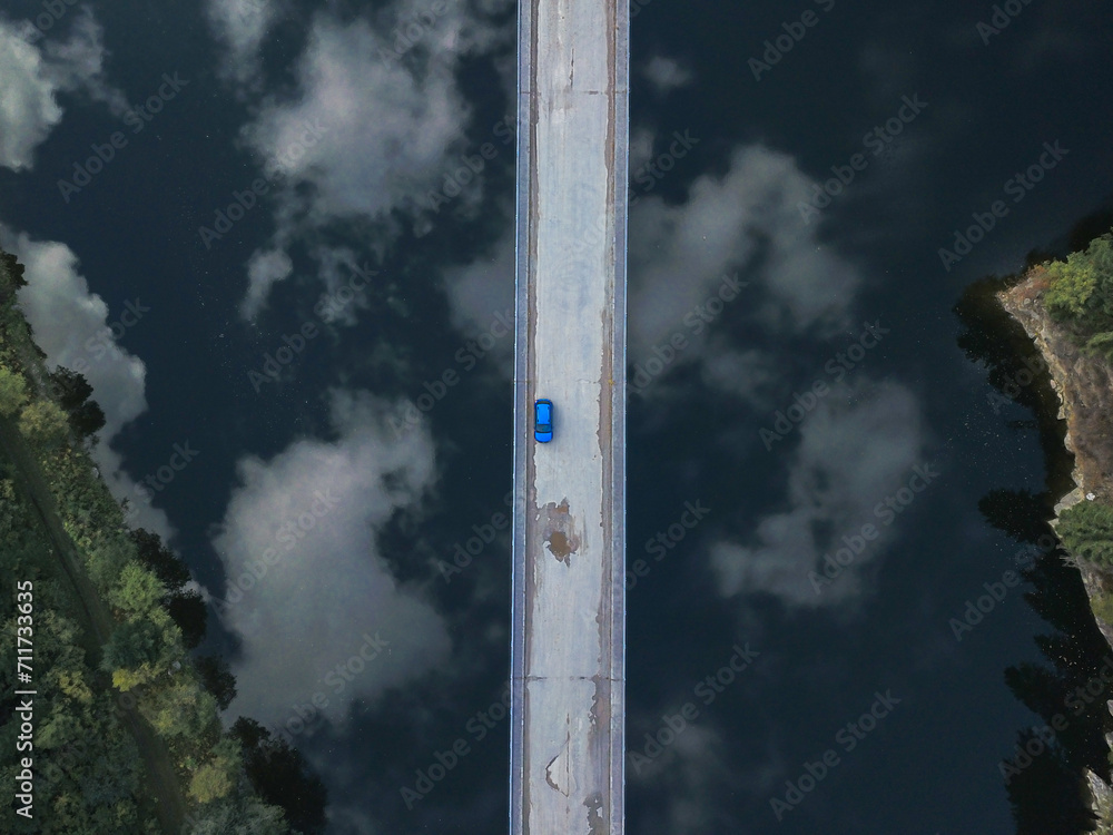 Above view from drone flight of a car crossing a bridge over a lake. The clouds are reflecting into the calm waters of the lake. Forests growing near the shores. Carpathia, Romania.