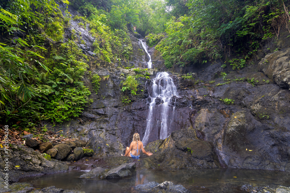 A young woman at the Gembleng Waterfall in Bali Island, Indonesia