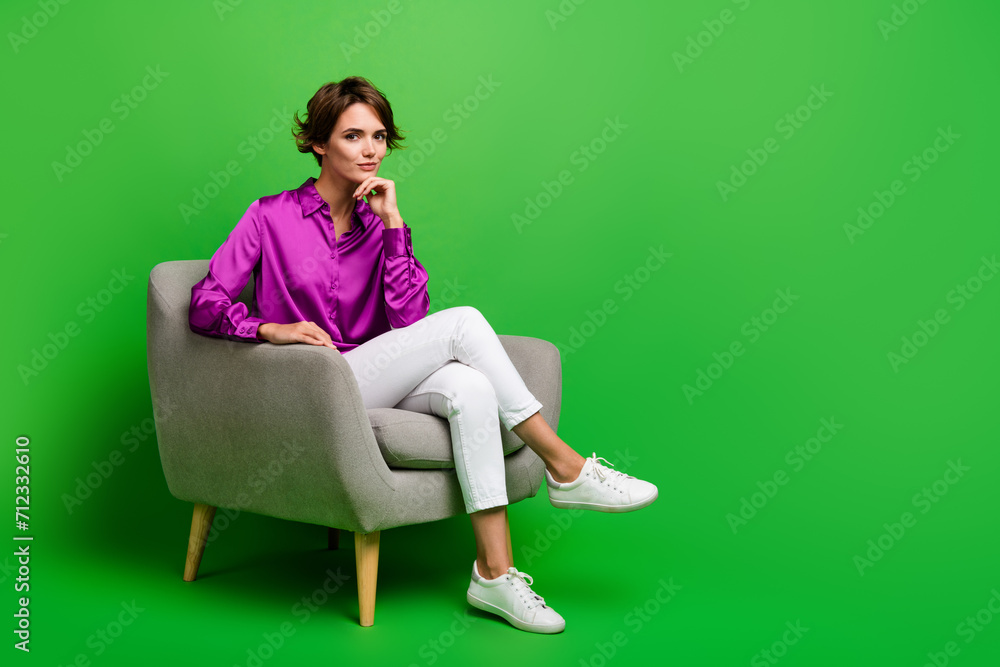 Full body photo of confident young psychologist woman pink shirt touch chin sitting at office armchair isolated on green color background
