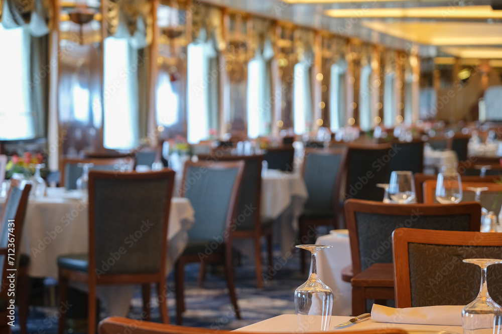 Art Deco interior design style furniture, carpets and paneling onboard classic ocean liner cruiseship cruise ship main dining room restaurant