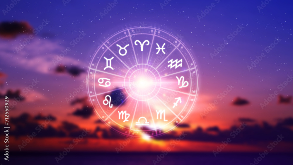 Concept of astrology and horoscope, person inside a zodiac sign wheel, Astrological zodiac signs inside of horoscope circle, Astrology, knowledge of stars in the sky, power of the universe concept.