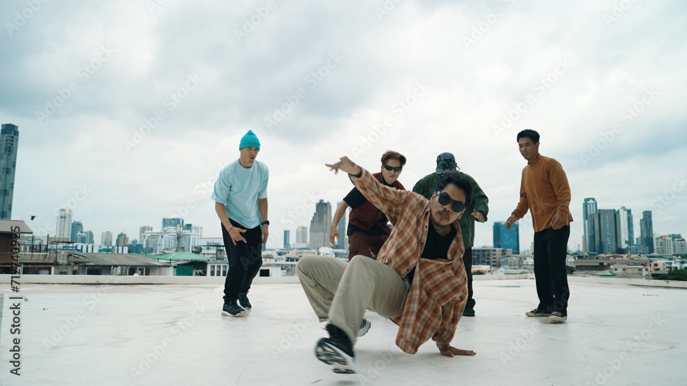 Professional break dance team practice B-boy dance while multicultural friends at rooftop. Young modern dancing group doing hip hop movement. Style,fashion,action. Outdoor sport 2024. Endeavor.