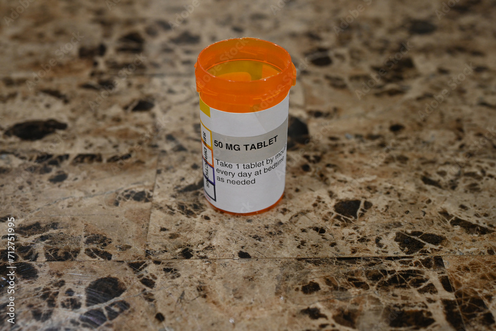 Closeup of a pharmaceutical container for 50 mg tablets.