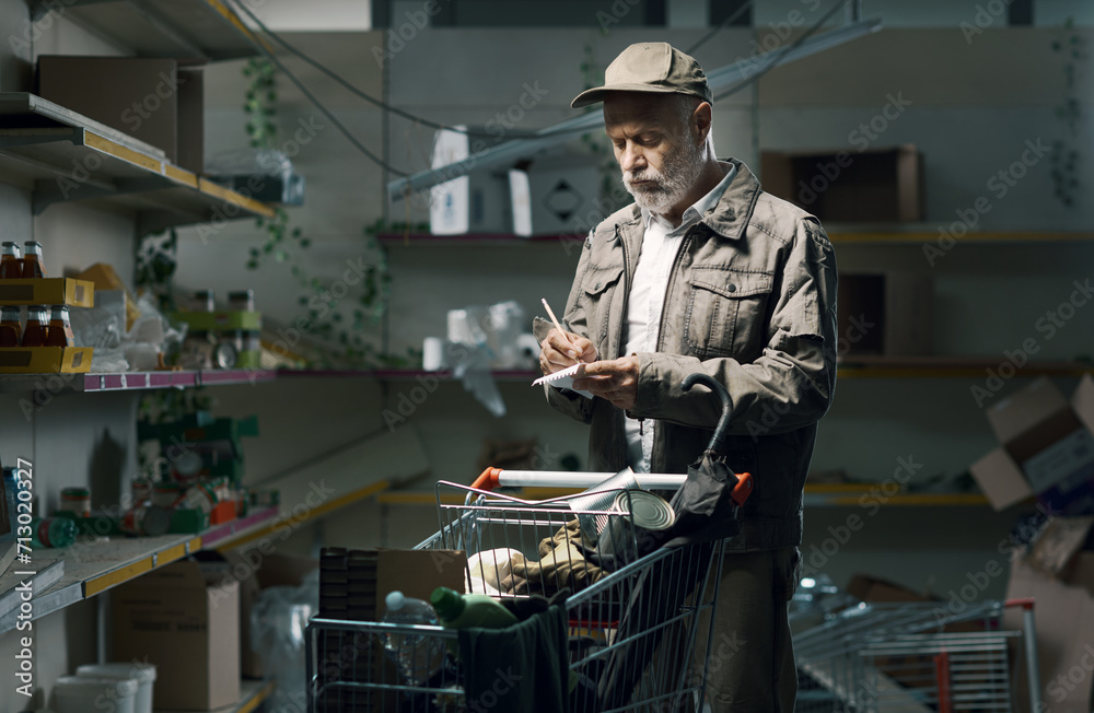Hopeless senior man doing grocery shopping in a destroyed supermarket