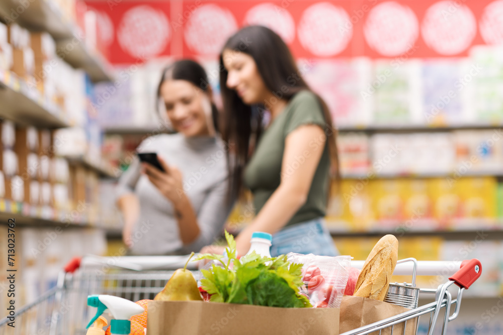 Women doing grocery shopping and using their phones