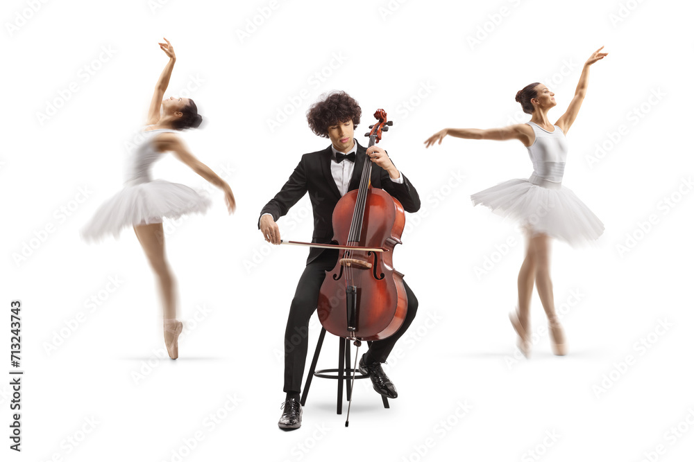 Male cellist sitting on a chair and performing and ballerinas dancing in the back