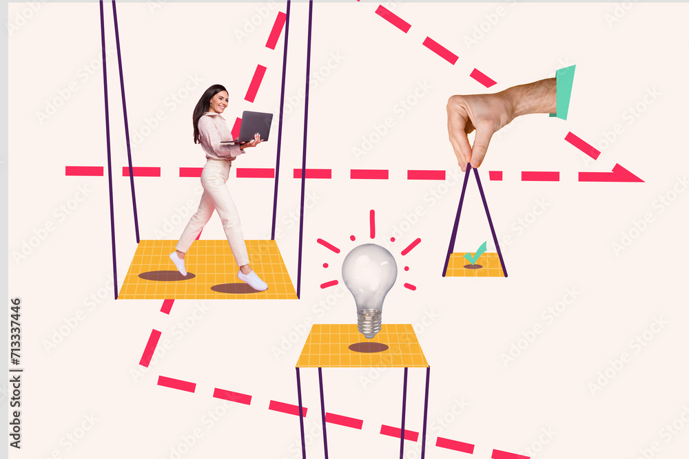 Horizontal surreal photo collage with busy businesswoman work online hold laptop walk on platforms checkmark done lightbulb idea solution