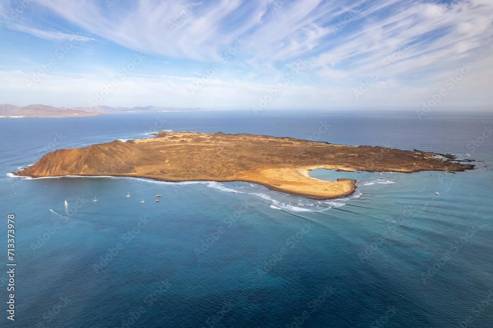 The drone aerial view of Lobos Island. Lobos is a small island of the Canary Islands located north of the island of Fuerteventura.