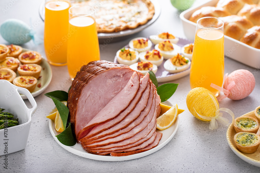 Easter brunch on large table with spiral sliced ham, quiche, deviled eggs and hot cross buns