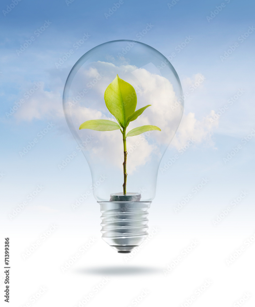 Bulb light with money green tree inside on sky blue cloud backgr