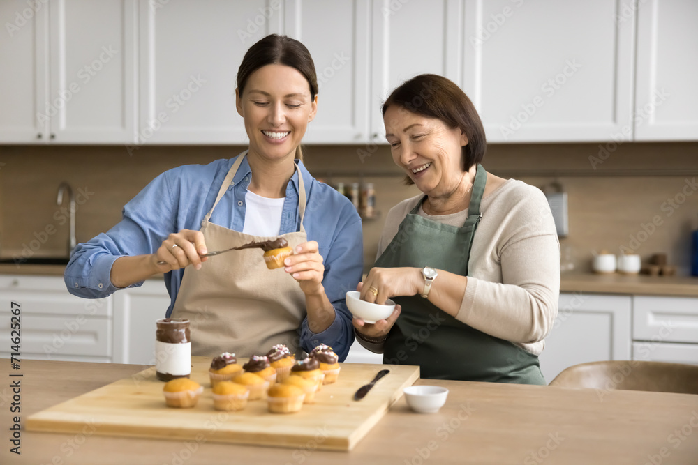 Happy old mature mother and adult child woman cooking delicious homemade dessert for family birthday party, applying chocolate paste on top of cupcakes, preparing sweet pastry together