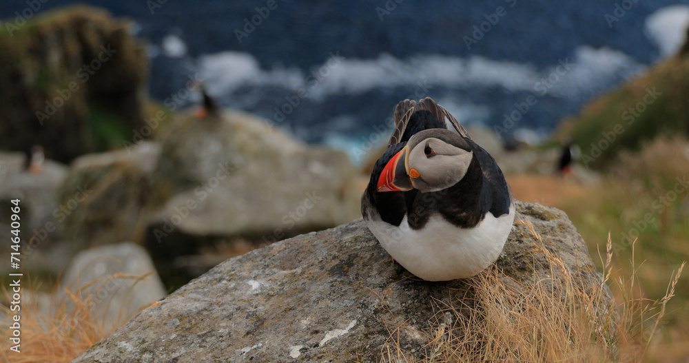 Atlantic puffin (Fratercula arctica), on the rock on the island of Runde (Norway).