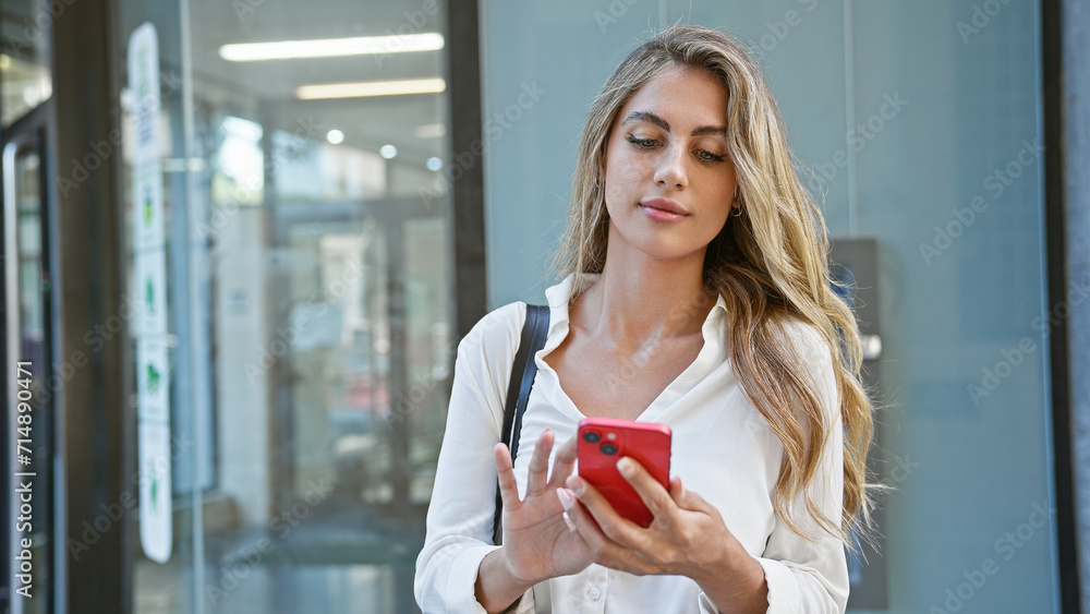 Attractive young blonde woman seriously engrossed in her cellphone, standing coolly on a sunny, urban street, with a relaxed concentration that's all about today's digital lifestyle.