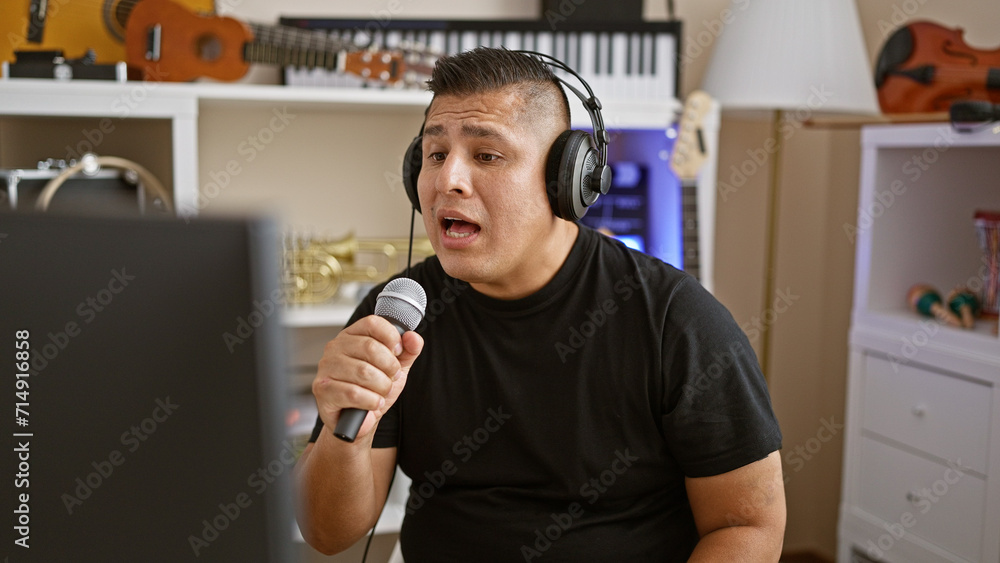 Striking portrait, serious young latin man, a professional musician, totally engrossed singing his song, unleashing his handsome voice in a music studio during a leisurely filled performance
