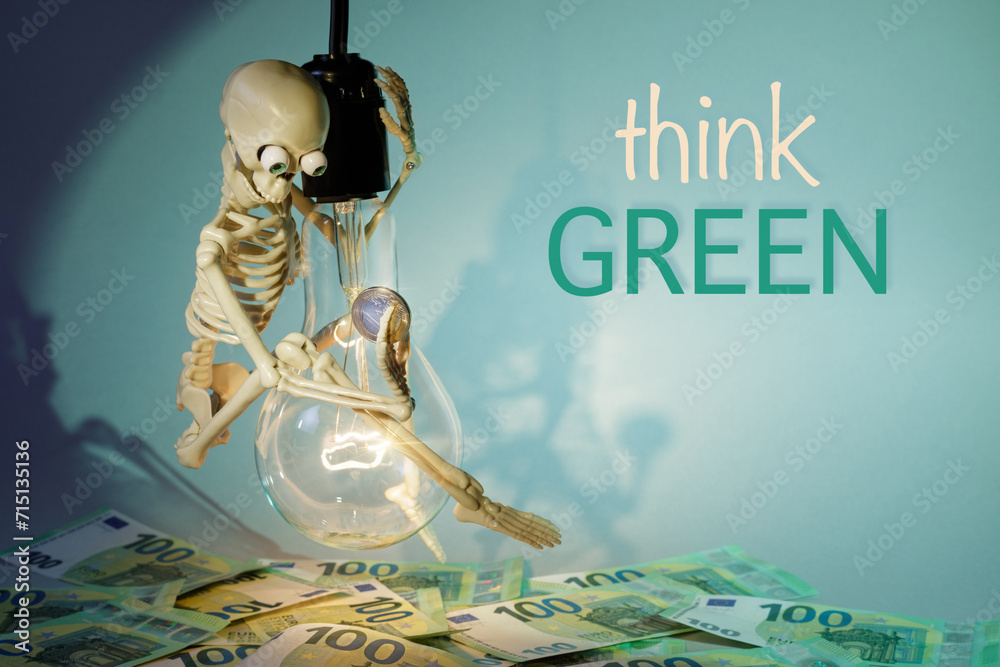A funny and clever skeleton swinging on a light bulb, against a green background, campaigns to green energy, ecology, and money save. Text in the photo- Think Green