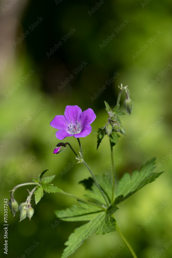 Forest geranium (Geranium sylvaticum) flowers illuminated by the suns on a green background