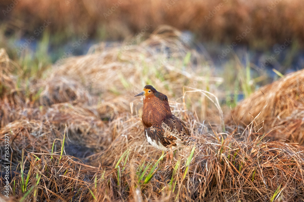 Male Ruff (bird) in breeding plumage stands on the shore of the lake