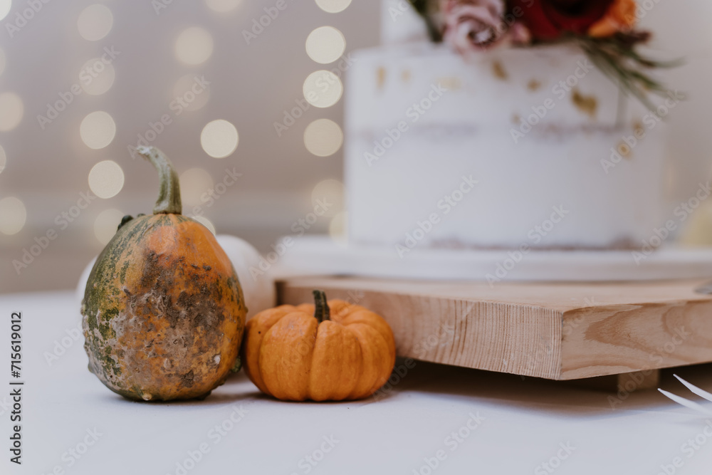 Bottom of autumnal wedding cake in the background of pumpkin decorations