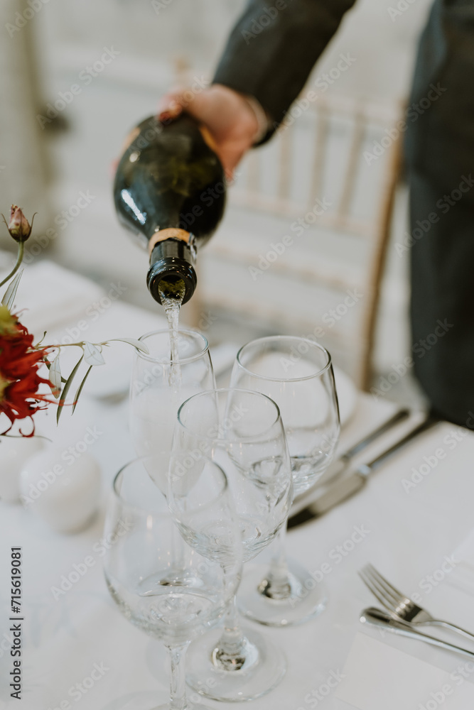 Champagne or prosecco being poured into a glass by a wiaters hand close up