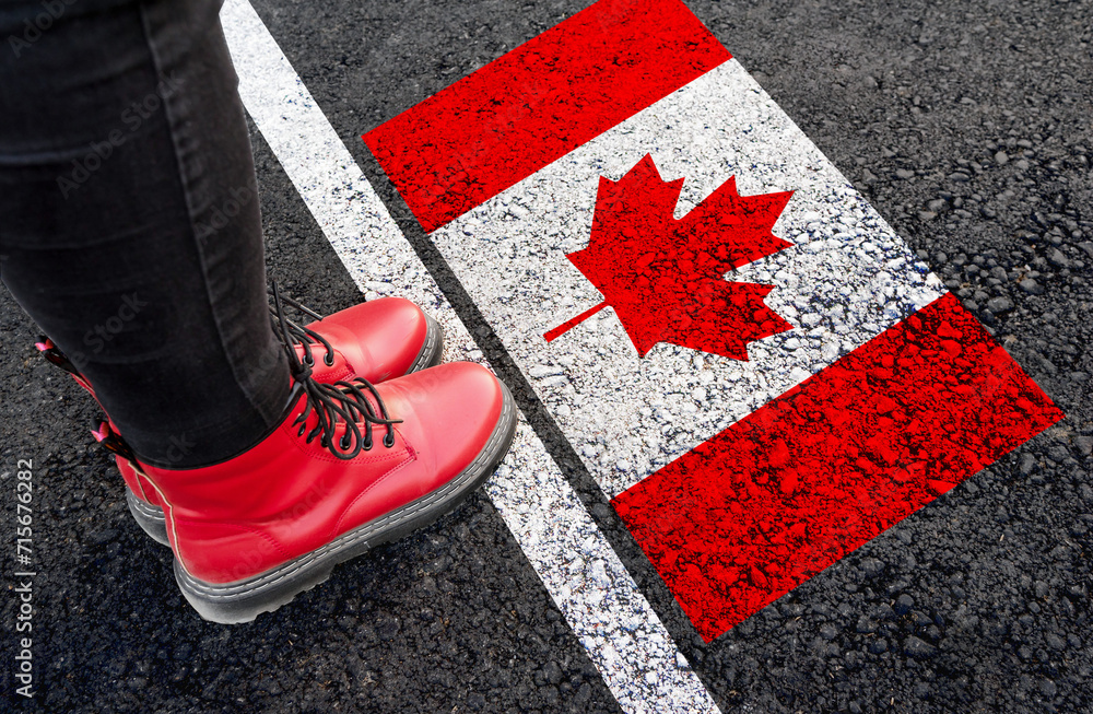 a woman with a boots standing on asphalt next to flag of Canada and border