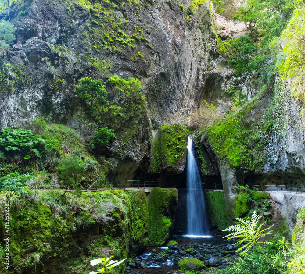 Levada Nova and Levada do Moinho in Madeira. Beautiful hiking path next to the levadas with waterfalls and tunnels