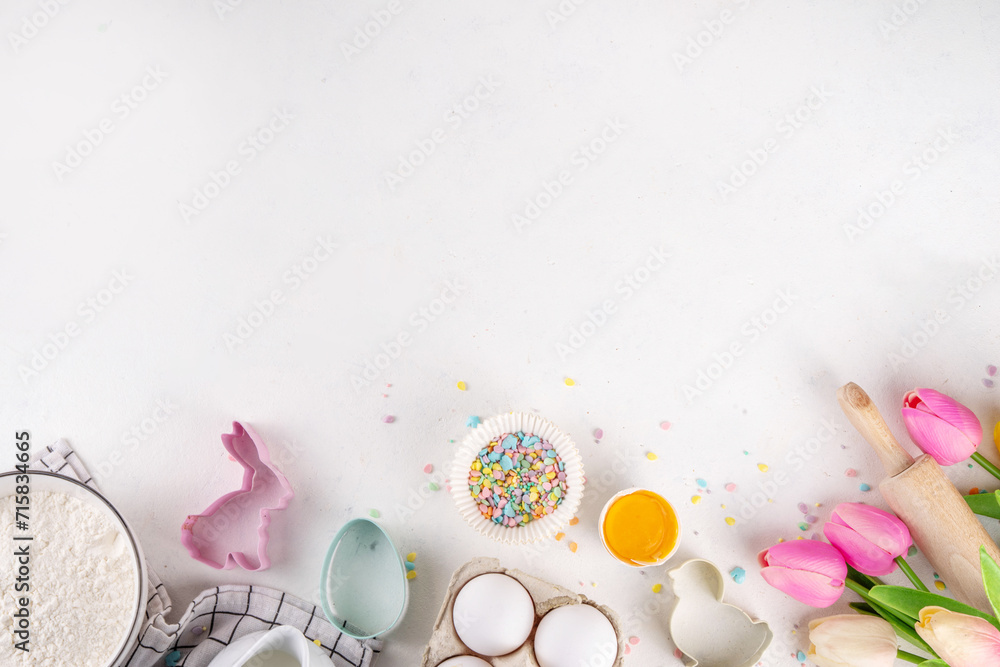 Easter baking background, ingredient for making Easter cookies, cakes, dessert with Easter chocolate eggs, sugar sprinkles, baking ingredients, flour, egg, milk, rolling pin, spring flowers top view