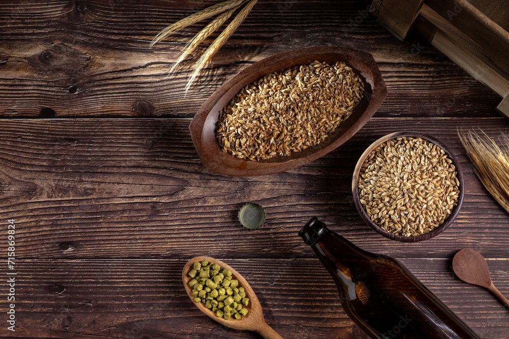 Barley in wooden bowl and granulated hops in a wooden spoon on a wooden table. Ingredients for craft beer.
