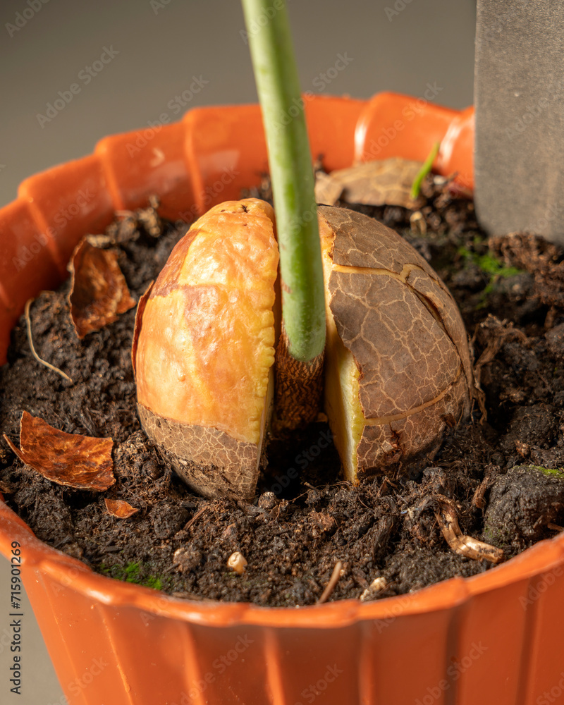 Sprouted avocado seed planted in the ground. Macro shot of avocado sprout.