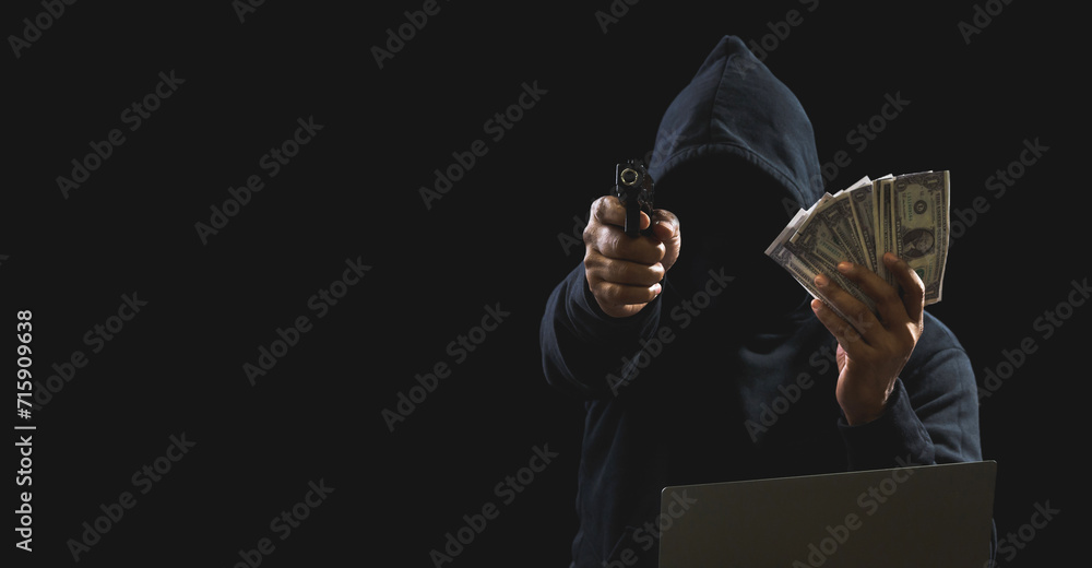 Portrait killer hacker gangster spy man one person in black hoodie standing look hand holding gun money dollar obtained from robbery threats crime attack victim people night dark background copy space