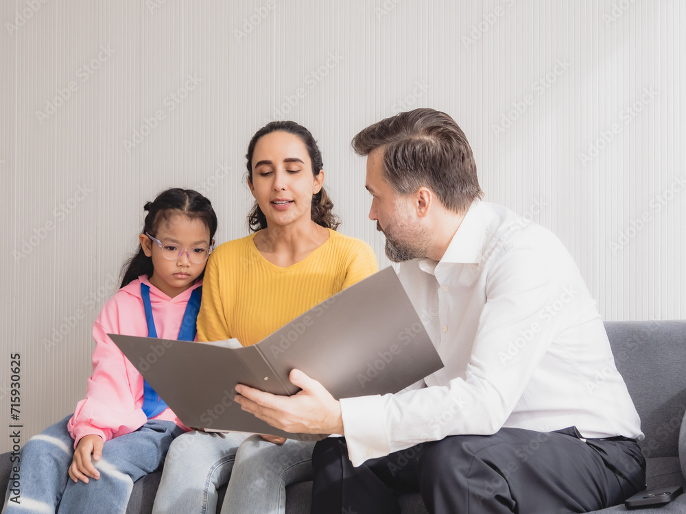 Portrait latin woman and daughter sit sofa with man business caucasian sitting two pason talk giving advice and think analyze look insurance, investment and financial documents in agreement in room