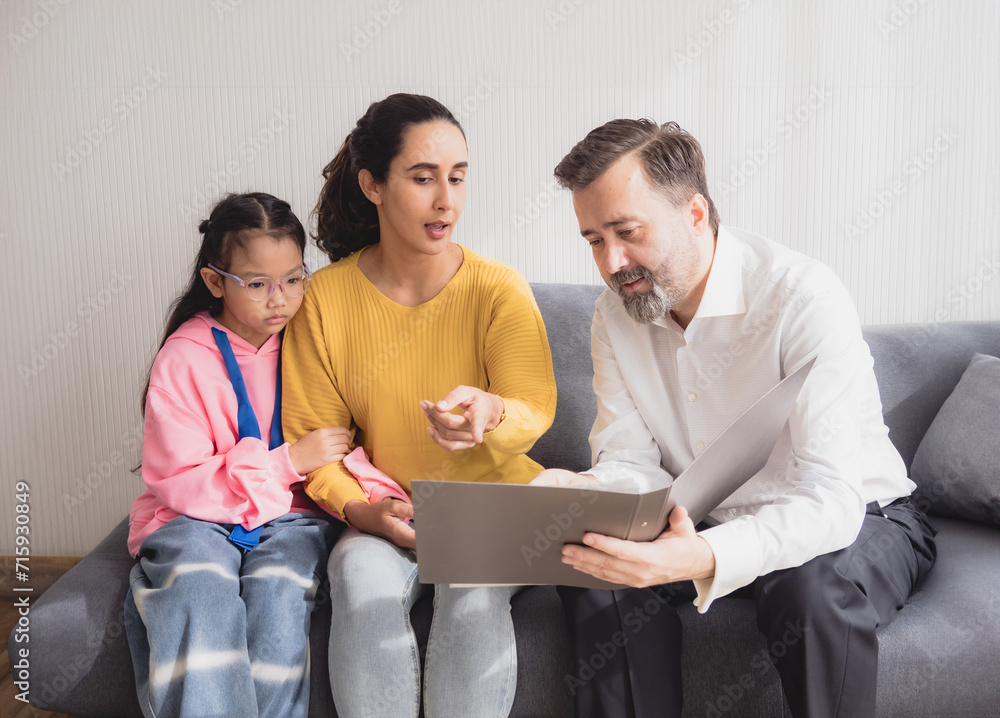 Portrait latin woman and daughter sit sofa with man business caucasian sitting two pason talk giving advice and think analyze look insurance, investment and financial documents in agreement in room