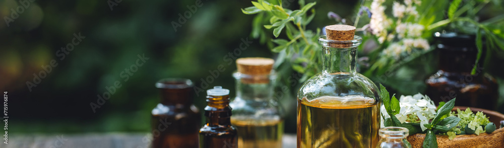 Natural organic essential oil in small glass bottles on wooden background. Homemade production for spa, sauna, bath. Relaxation, alternative medicine, remedy, naturopathy, pure ingredients