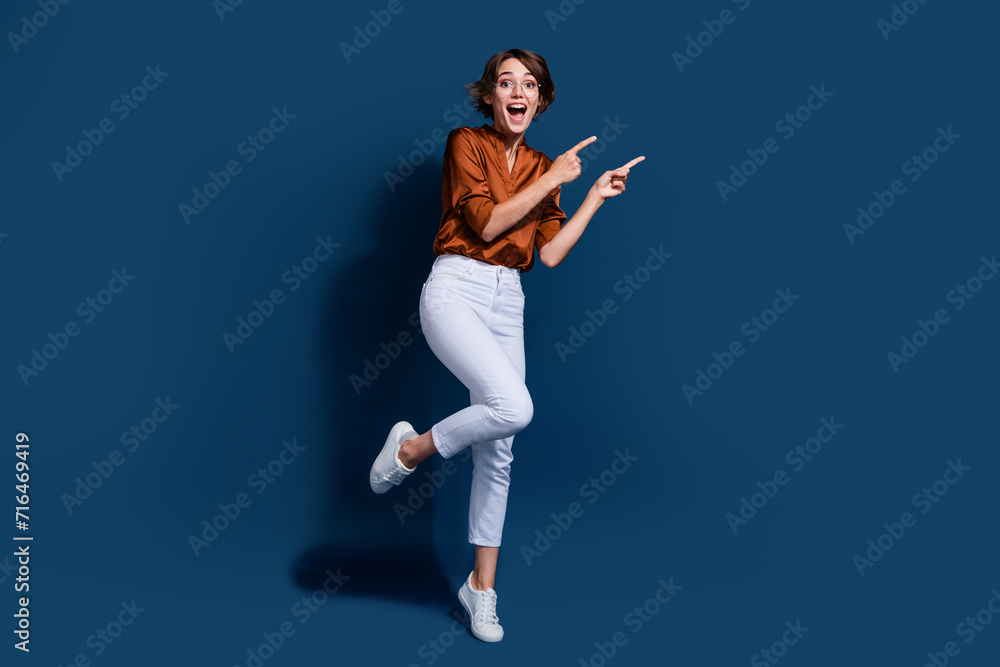 Full body photo of attractive young woman point excited empty space wear trendy brown blouse isolated on dark blue color background
