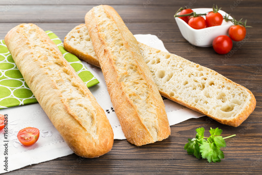 baguettes on a towel, French bread, wooden background