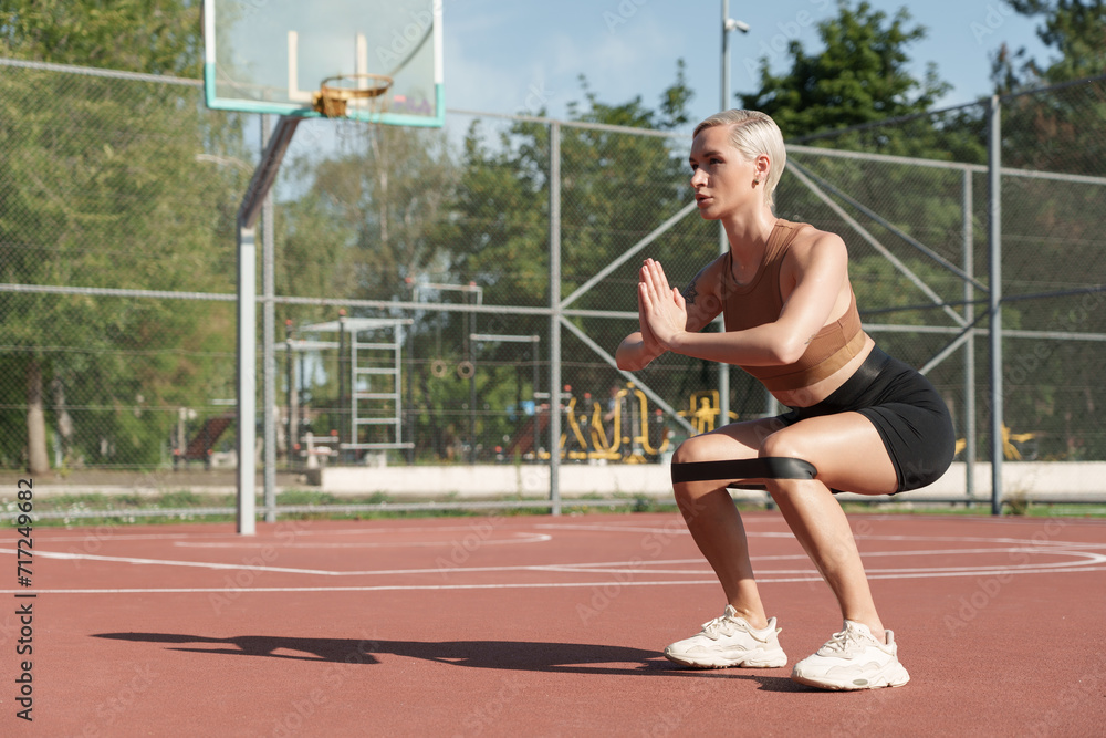 An athletic woman engages in a powerful squat workout with resistance bands at a sunlit basketball court