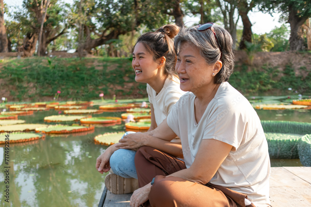 Side view of asian Thai Chinese elder mother and daughter sitting on the bank by lotus flower lake local lagoon, both woman happy smiling, travel on vacation.