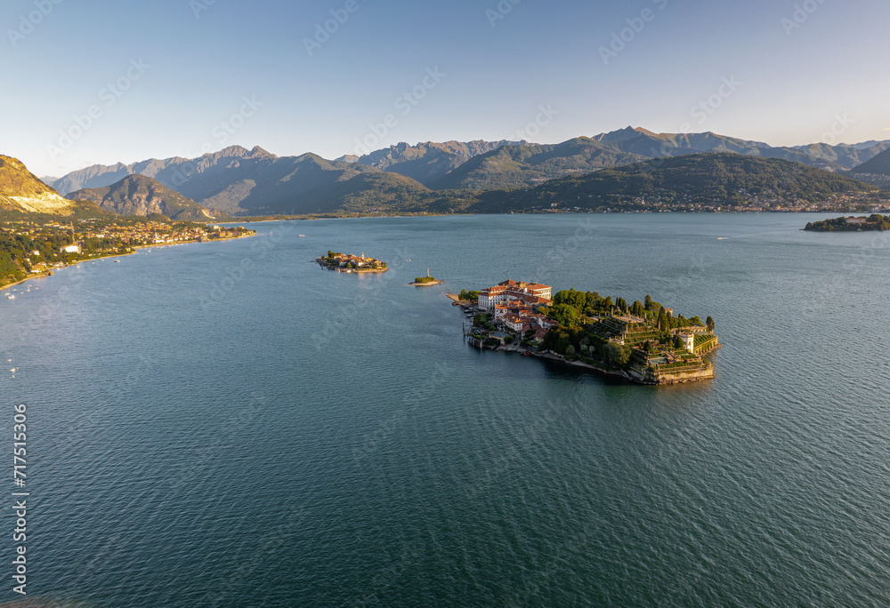 The drone aerial view of Borromean islands on Maggiore Lake and Stresa town, Italy. The Borromean Islands are a group of three small islands and Isola Bella.