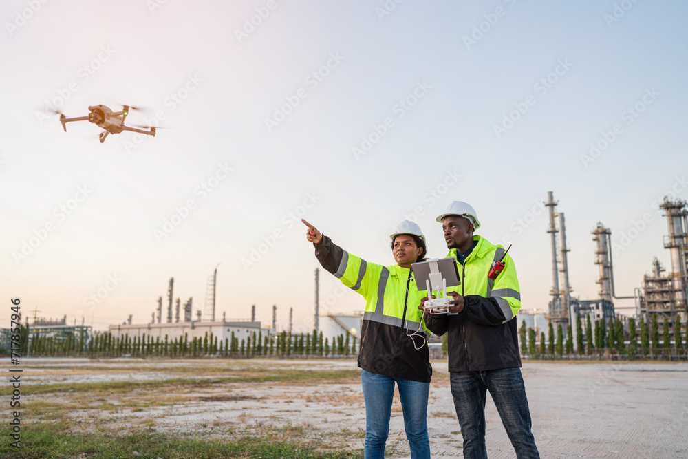 Drone operated by construction worker on building site. Engineer location use drone to fly inspections at industrial plant at sunset.