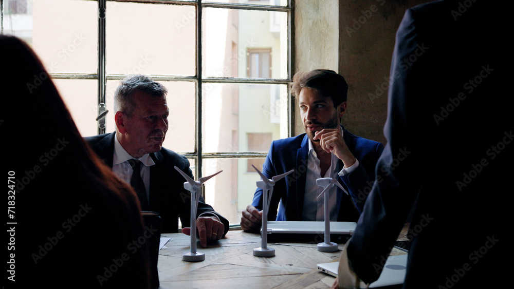Renewable energy. Multi-generational business people meeting working on environment and sustainable innovation project