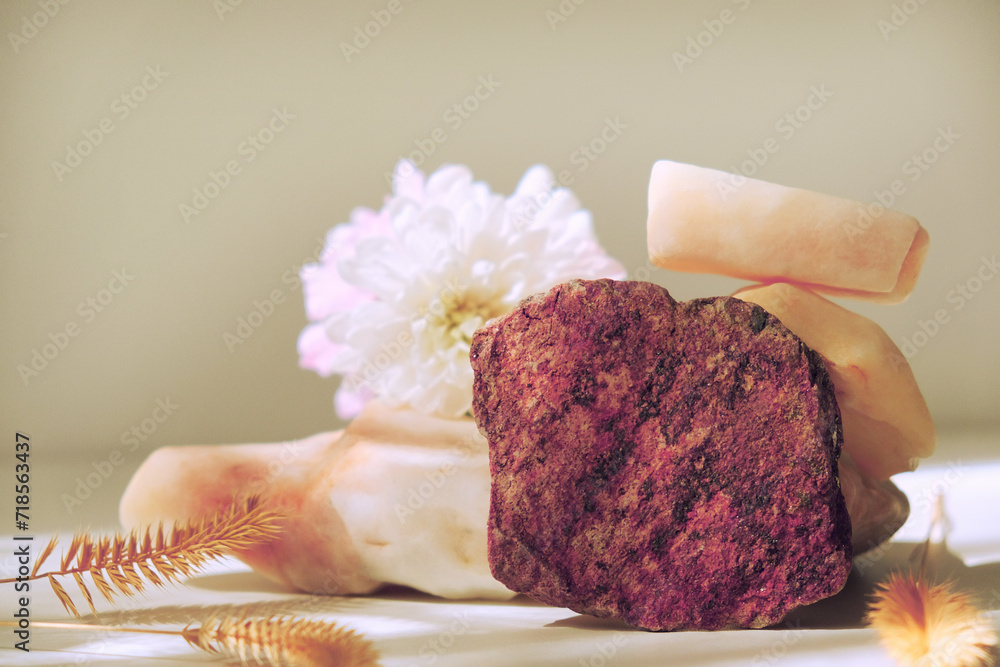 Template, marble podium with stone and flower, dry flowers, empty space. Ikebana