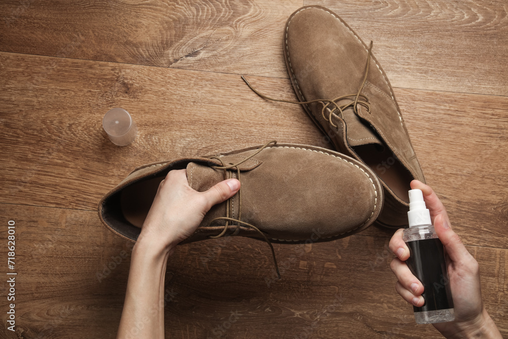 Hands apply water-repellent spray to suede shoes on the floor. Top view. Shoe care