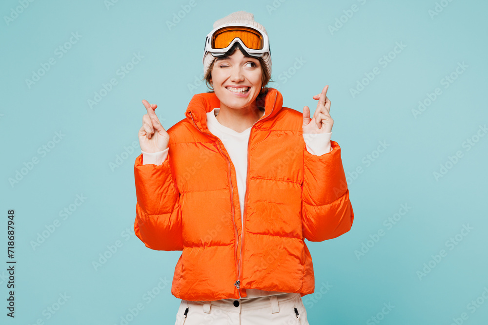 Skier young woman wears warm padded windbreaker jacket hat ski goggles mask hold finger up with great new idea travel rest spend weekend winter season in mountains isolated on plain blue background