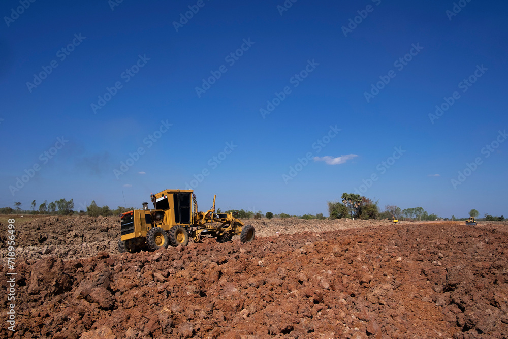 Road grader is pushing dirt. Motor grader is working,smoothing gravel surface for new road.