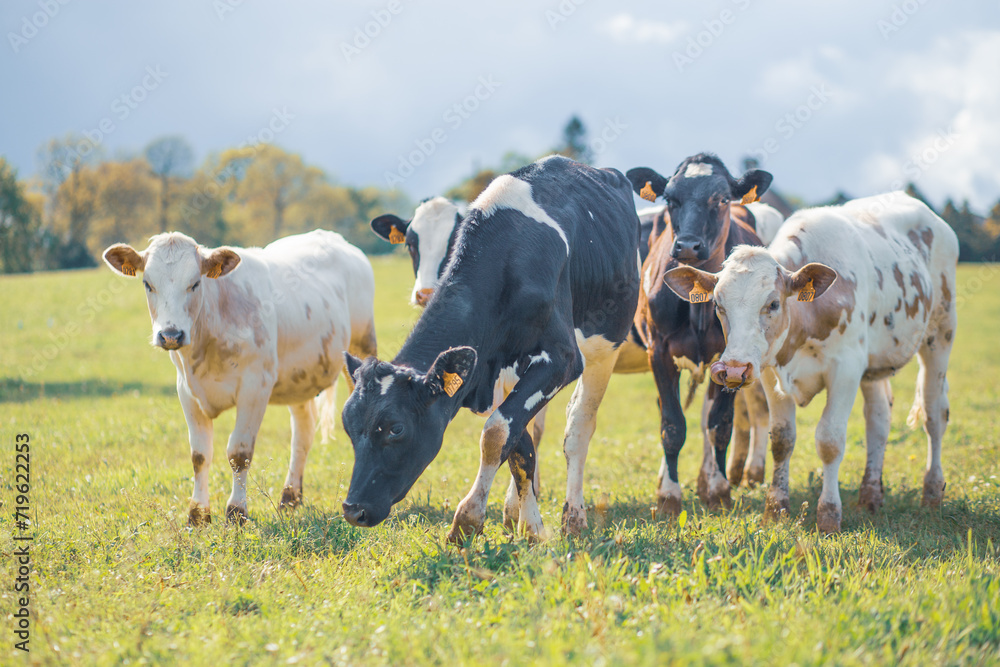 Group of cows together gathering in a field