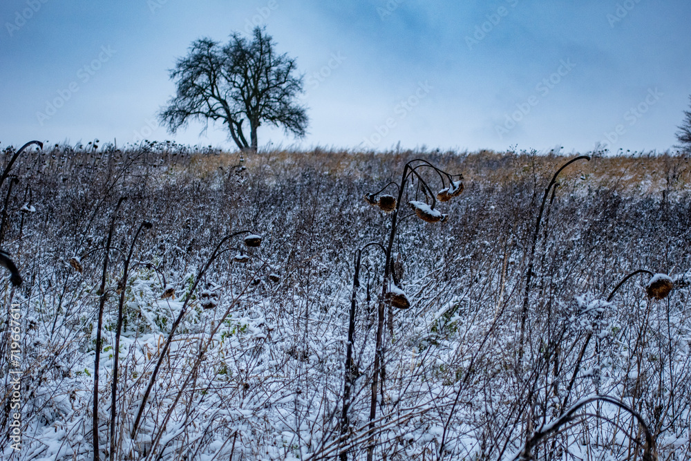 Verwelkte Sonnenblumen in Schneelandschaft